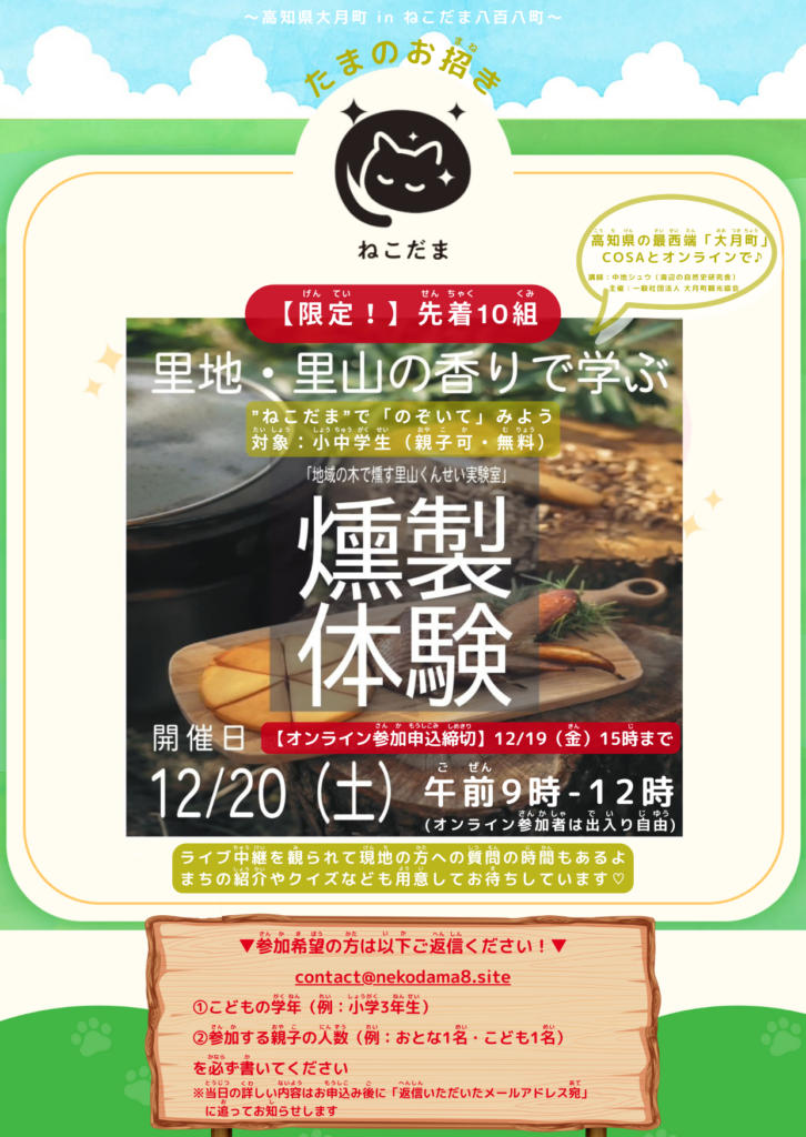 ▼「地域の木で燻す 里山くんせい実験室」の視聴体験イベント~高知県大月町 i n ねこだま八百八町~