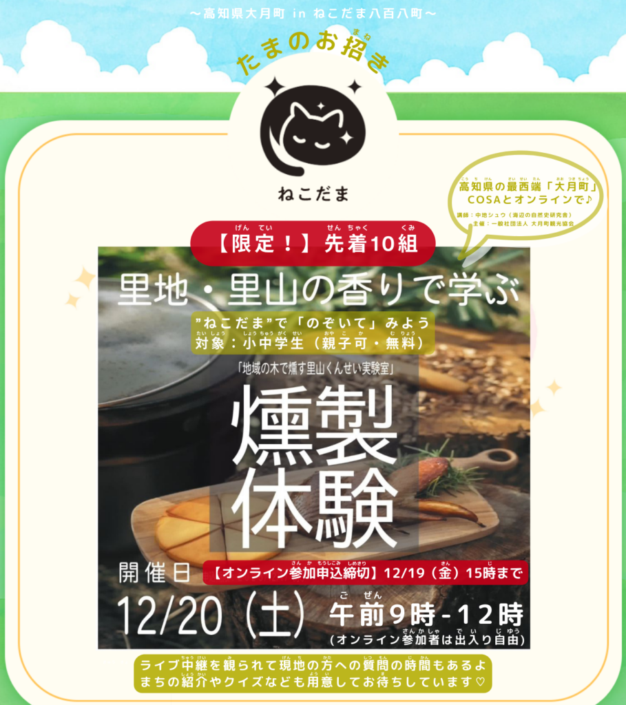 あたらしい”まなびそだち”の場「ねこだま」を展開する株式会社旦は、はかり知れない魅力を秘めた地域の取り組みと小中学生の双方をつなぐハイブリッドイベントを開催しました。昨年12月20日(土)午前9時-12時、COSA(旧小才角小学校)での「地域の木で燻す 里山くんせい実験室」のオフラインイベントを「ねこだま」のオンラインイベント会場でライブ中継。オンラインを通じた交流によって、”東京から陸路で最も遠い”とも言われる高知県の最西端「大月町」とその距離を越えてつながり、参加者の皆様にも自然豊かで魅力あふれる大月町に興味を持っていただくことができ、互いに大きな気づきと刺激を得られる貴重な体験となりました。